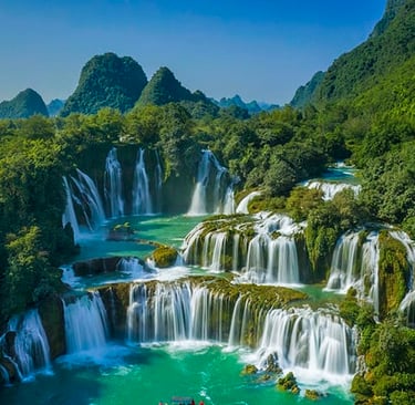Cao Bằng et Ban Giốc : Pousse jusqu'aux provinces reculées de Cao Bằng pour contempler les majestueuses chutes de Bản Giốc, l'une des plus belles cascades au monde, nichée à la frontière chinoise. Tu peux aussi explorer le lac de Ba Bể, surnommé la Baie d'Halong des montagnes.