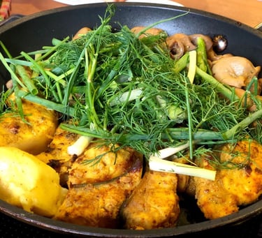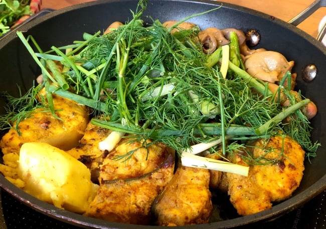Poisson (type Lang) grillé au curcuma sur un lit d’aneth et ciboulette. Un plat typique d’Hanoï à ne pas manquer.